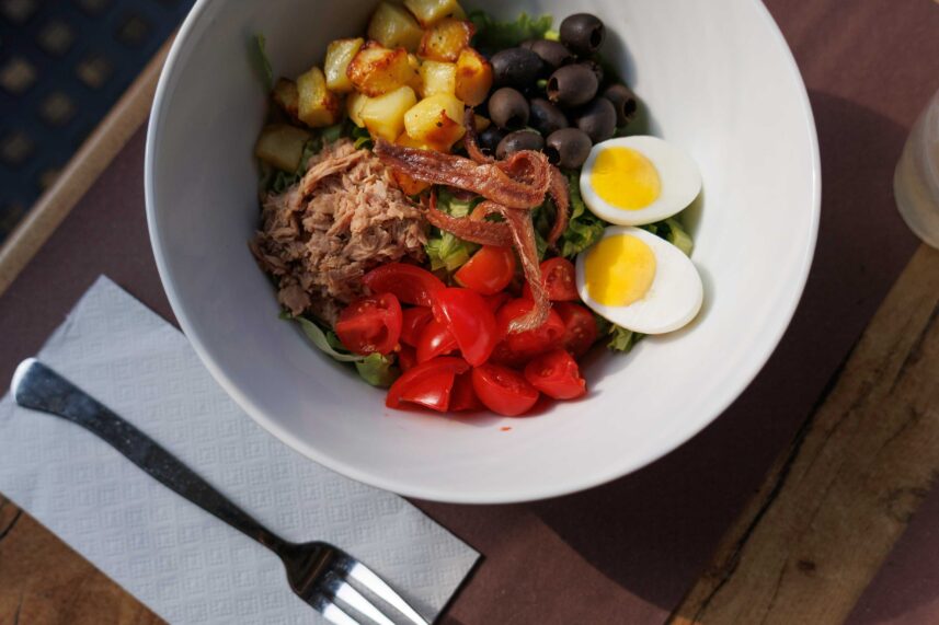 • Insalata verde, pomodorini, tonno, uovo sodo, patate al forno, olive nere, due acciughe